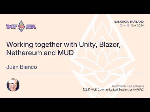 This is a project demo as part of the MUD Day CLS: autonomous worlds, onchain games, and explores how Unity, Blazor, Nethereum, and MUD integrate to build blockchain-based games and applications. It covers the overall architecture and structure of .NET projects, including smart contract integration and core logic. Key topics include Nethereum's integration with MUD systems and tables, extended code generation to support MUD, deployment strategies, bulk saving, data synchronization, and testing.