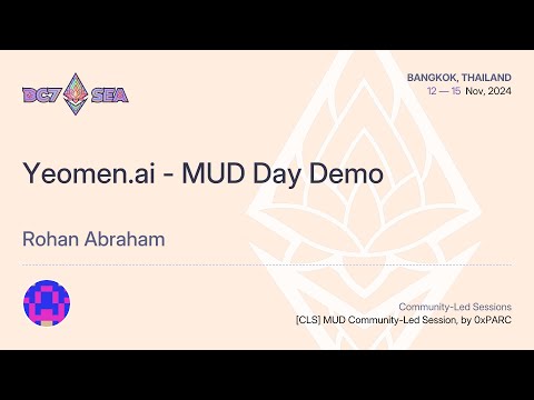 This is a project demo for MUD Day CLS: onchain games and non-financial applications. Yeomen.ai is building dashboards, automation tools, marketplaces, and platforms for autonomous worlds and onchain games built with MUD. Rohan will showcase some of these tools in this demo session.