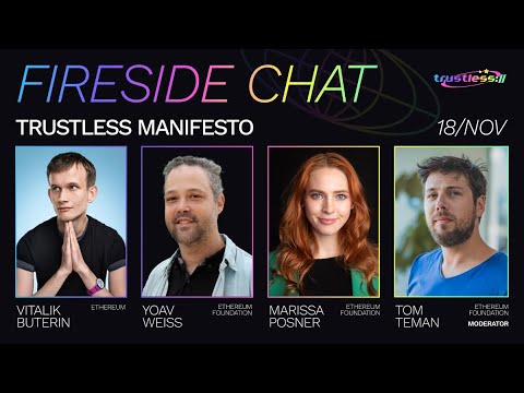 Tom Teman moderates a fireside chat with Vitalik Buterin, Yoav Weiss and Marissa Posner (all from the Ethereum Foundation) to further explore the recently published trustless manifesto and how it ties into the core values of Ethereum, its goals and its vision Talk given during day 1 of the trustless:// conference at Devconnect Argentina 2025 https://trustlessconference.com