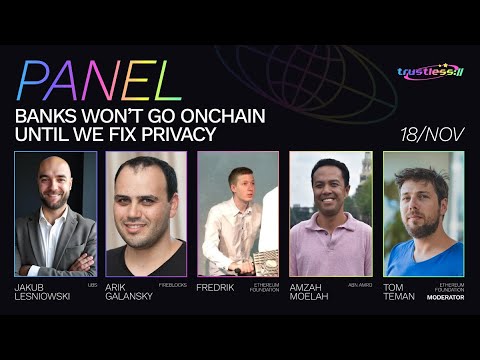 This panel moderated by Tom Teman (Ethereum Foundation) together with Fredrik (Ethereum Foundation), Arik Galansky (Fireblocks), Amzah Moelah (ABN AMRO), Jakub Lesniowski (UBS) discuss the fact that public blockchains are transparent by design - an uncomfortable reality for banks that handle confidential client and operational data. This panel unpacks why privacy is the missing piece preventing institutions from fully embracing onchain finance. Together with experts from leading banks and the Ethereum ecosystem, we’ll explore regulatory compliance through zero-knowledge proofs, user and institutional privacy, and the balance between transparency, trustlessness, and confidentiality in decentralized systems. Talk given during day 1 of the trustless:// conference at Devconnect Argentina 2025 https://trustlessconference.com
